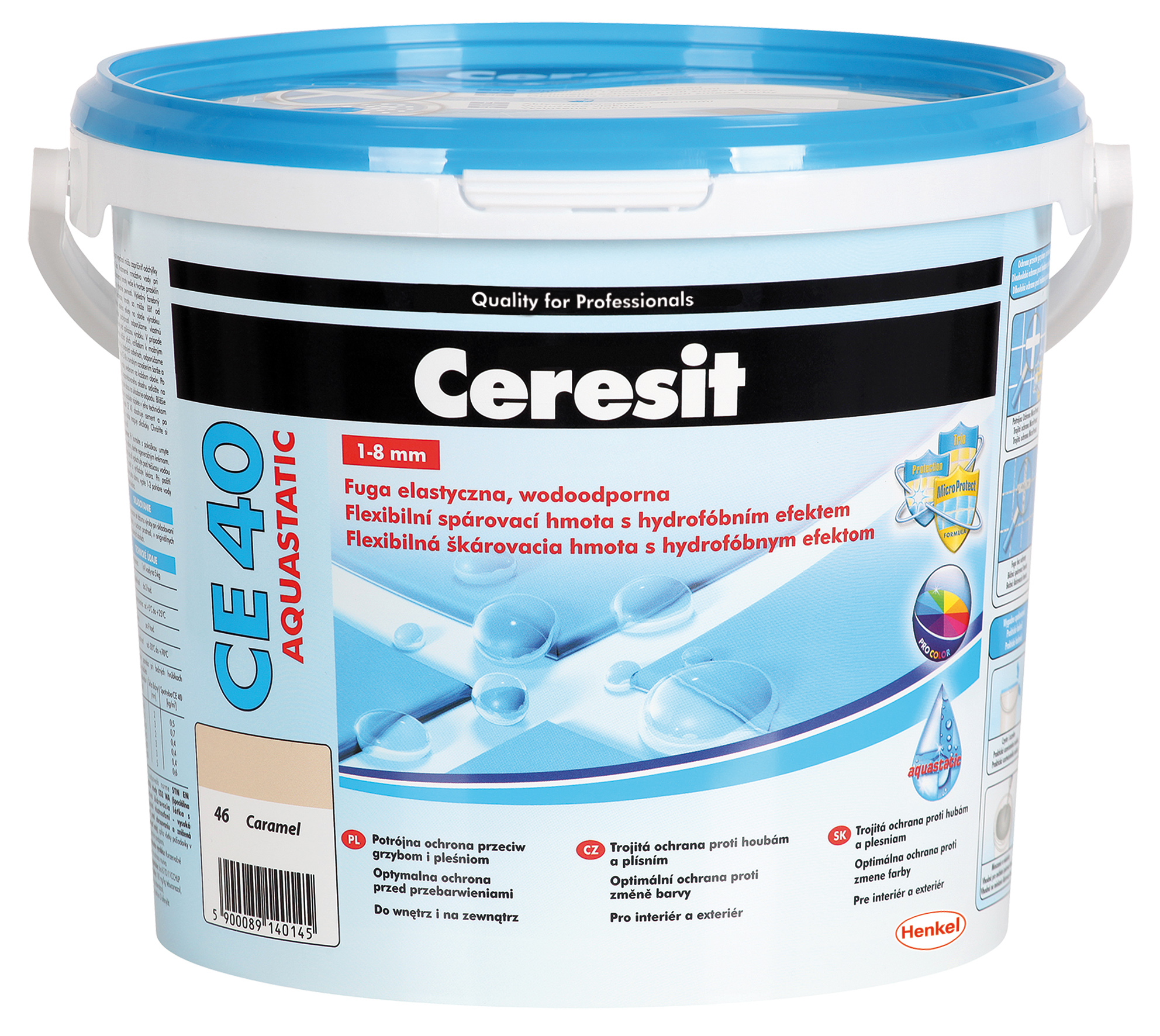 CERESIT fuga elastyczna do płytek CE 40 - 5 kg, 1-8 mm - zaprawa Ceresit CE 40 służy do spoinowania płytek gresowych, innych typów płytek ceramicznych, szklanych oraz kamiennych (również marmurów), zarówno na powierzchniach pionowych i poziomych. Potrójna Ochrona MicroProtect – formuła zawiera 3 specjalnie dobrane substancje czynne, które zapewniają długą i skuteczną ochronę przeciw grzybom i pleśniom. Formuła chroni nie tylko samą spoinę, lecz również przyległe do niej powierzchnie płytek (strefa inhibicji), zapewniając estetyczny wygląd okładziny ceramicznej. Efekt Aquastatic – powierzchniowe uszczelnienie spoiny (hydrofobizacja) powoduje, że krople wody utrzymują się w formie perełek na powierzchni fugi, co wydłuża znacząco działanie pleśniobójcze oraz chroni fugę przed zabrudzeniami. Zalety te umożliwiają eksploatacje spoiny w miejscach szczególnie narażonych na okresowe działanie wody np. łazienki, prysznice, kuchnie. Może być stosowana wewnątrz i na zewnątrz budynków. Szczególnie polecana, gdy płytki mocowane są na podłożach odkształcalnych: ogrzewane podłogi, płyty wiórowe i gipsowo-kartonowe. Wodoszczelność i odporność na oddziaływanie chemikaliów zapewnia stosowanie fugi Ceresit: CE 79. Dylatacje między płytkami, spoiny w narożach ścian, w połączeniach ścian z posadzką i przy urządzeniach sanitarnych należy wypełnić silikonem Ceresit CS 25 MicroProtect, a w przypadku spoinowania marmurów CS 29. W celu dodatkowego zabezpieczenia spoin i okładzin ceramicznych przed zabrudzeniami poprzez hydrofobizację, należy stosować silikonowy impregnat Ceresit CT 10.