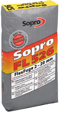SOPRO fuga szeroka elastyczna z trasem FL 2-20 mm, 25 kg - cementowa, elastyczna, zawierająca tras reński zaprawa do fugowania płytek i płyt ceramicznych, gresów, kształtek z kamienia naturalnego i betonu oraz szklanych kształtek budowlanych. Wyjątkowo nadaje się do słabo chłonnych płytek ściennych i podłogowych. Szczególnie zalecana na balkony, tarasy oraz do podłóg ogrzewanych.